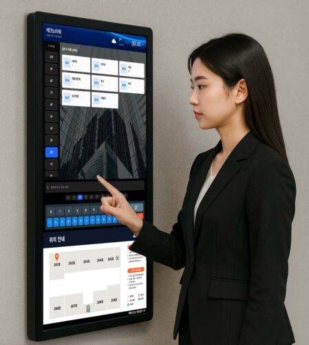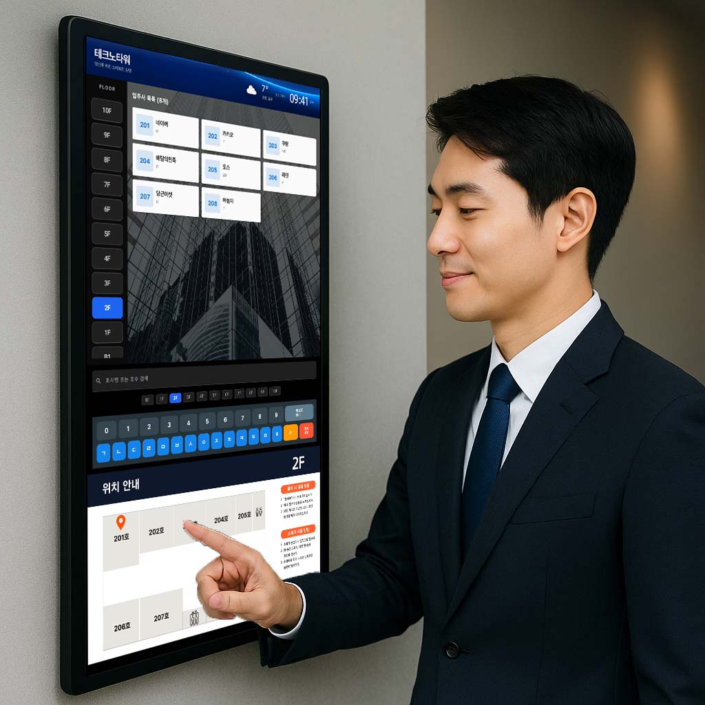 터치 기반 인터페이스를 통해 건물 내 다양한 정보를 쉽고 빠르게 검색할 수 있는 층별 안내 솔루션입니다.