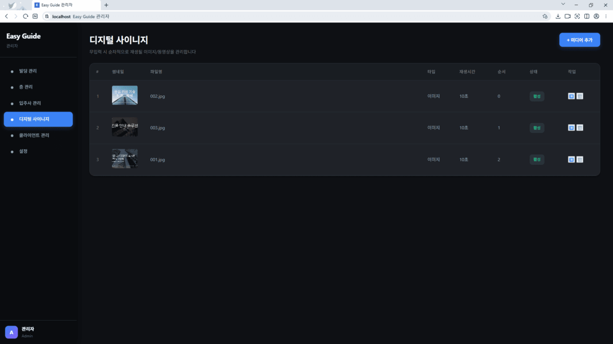 디지털 사이니지 메뉴는 무입력 상태에서 재생될 이미지 슬라이드를 한곳에서 관리하는 공간입니다. 새 미디어를 업로드하면 썸네일과 재생시간이 목록에 표시되고, 끌어서 순서를 바꾸거나 버튼으로 활성/비활성을 전환해 원하는 조합만 화면에 노출할 수 있습니다. 층 안내가 끝난 뒤 자동으로 돌아가는 광고·공지 슬롯을 이 메뉴에서 즉시 업데이트할 수 있어, 로비와 각 층의 메시지를 항상 최신 상태로 유지할 수 있습니다.