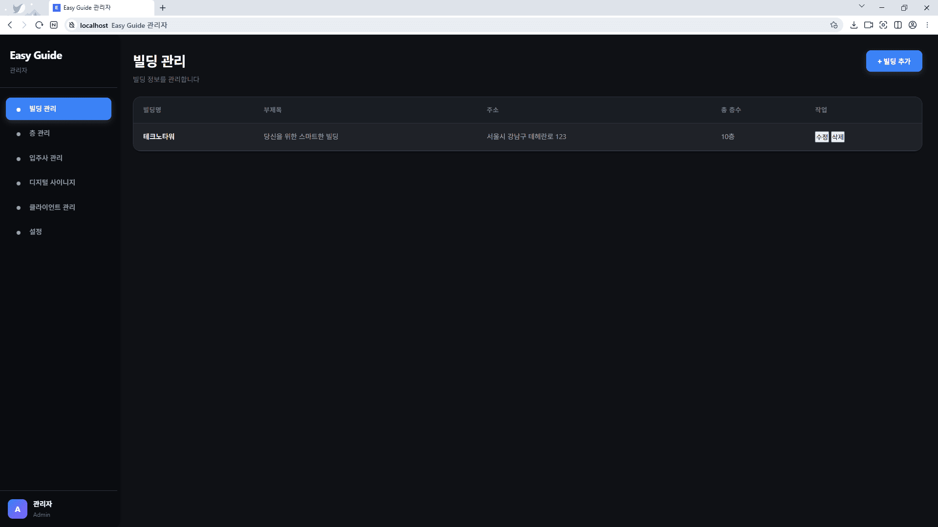 빌딩 관리 메뉴는 건물의 기본 정보를 한눈에 보고 손쉽게 관리할 수 있는 공간입니다. 빌딩명, 부제목, 주소, 층수를 입력해 새로 등록하거나 기존 항목을 수정할 수 있고, 언제든지 삭제해 목록을 정리할 수 있습니다. 등록된 빌딩은 다른 메뉴에서 층·입주사와 연동되어 즉시 적용되므로, 여러 건물·복합몰을 운영할 때도 체계적으로 관리할 수 있습니다.