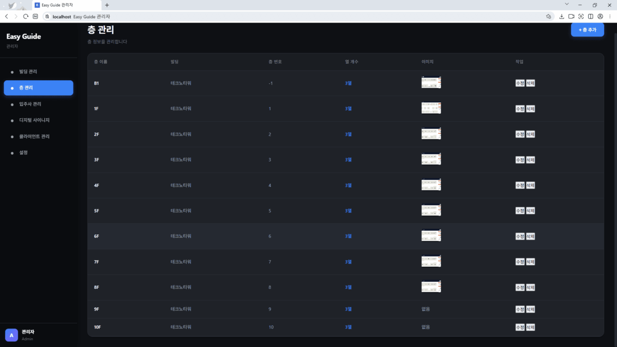 층 관리 메뉴는 선택한 빌딩의 층 정보를 등록하고 꾸밀 수 있는 작업 공간입니다. 층 번호와 이름을 지정해 새 층을 추가하거나 기존 층을 수정·삭제할 수 있고, 각 층에 맞는 평면도 이미지를 업로드해 안내 화면에 곧바로 반영할 수 있습니다. 층별 카드에서 열(column) 수까지 설정하면 키오스크의 입주사 카드 레이아웃이 자동으로 맞춰지므로, 층 구조와 운영 방식에 딱 맞는 안내 화면을 손쉽게 구성할 수 있습니다.