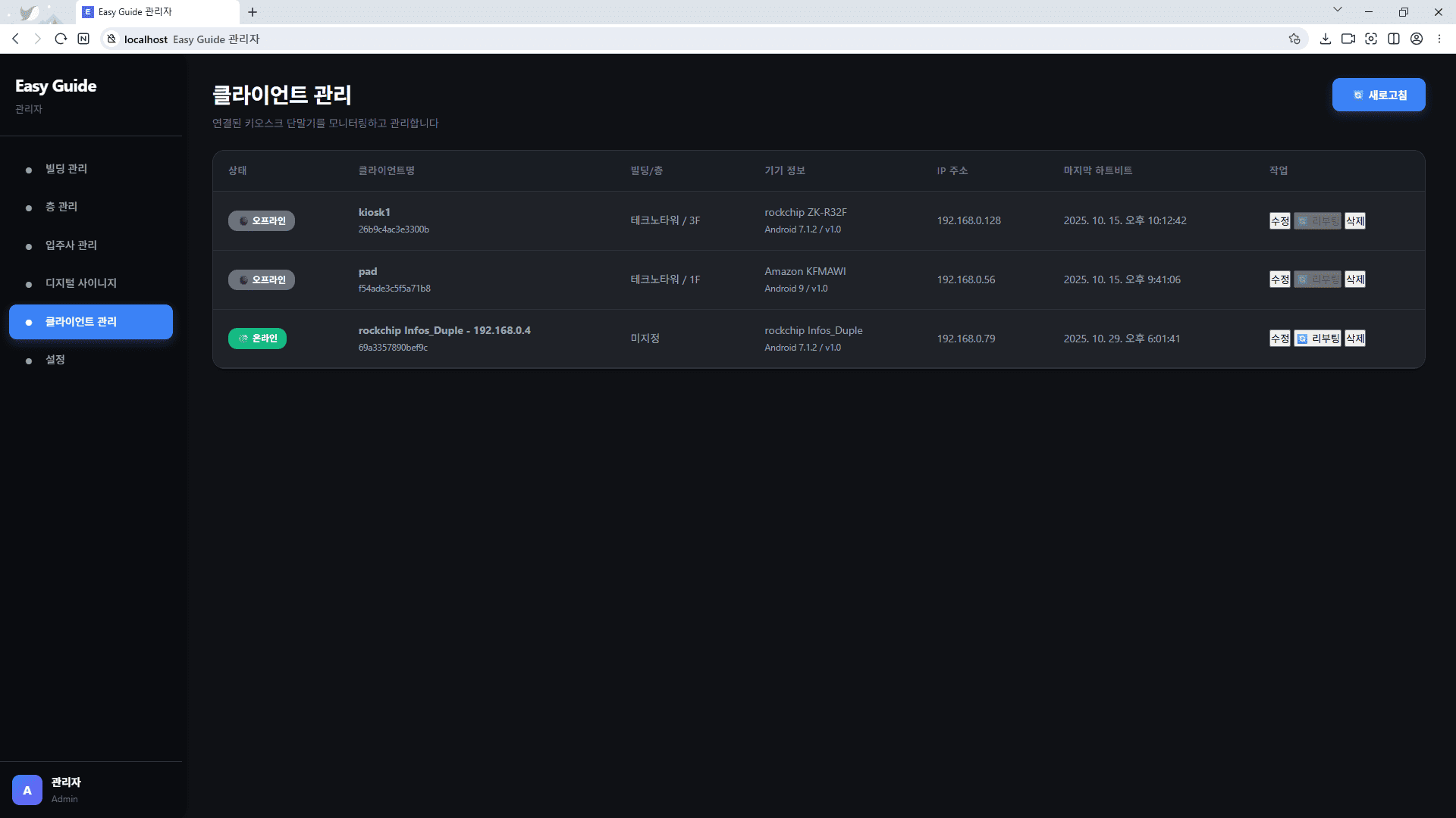 클라이언트 관리 메뉴는 각 층에 설치된 키오스크 단말을 실시간으로 모니터링하는 대시보드입니다. 단말별 이름, 연결된 빌딩·층, 기기 정보, IP, 마지막 하트비트 시간이 표시되어 있어 현재 상태를 한눈에 파악할 수 있고, 버튼 한 번으로 원격 재부팅이나 이름·위치 수정도 가능합니다. 일정 시간 신호가 끊기면 자동으로 오프라인으로 표시되어 장애를 빠르게 감지할 수 있으니, 여러 대의 디지털 사이니지를 운영할 때 필수 관리 메뉴입니다.