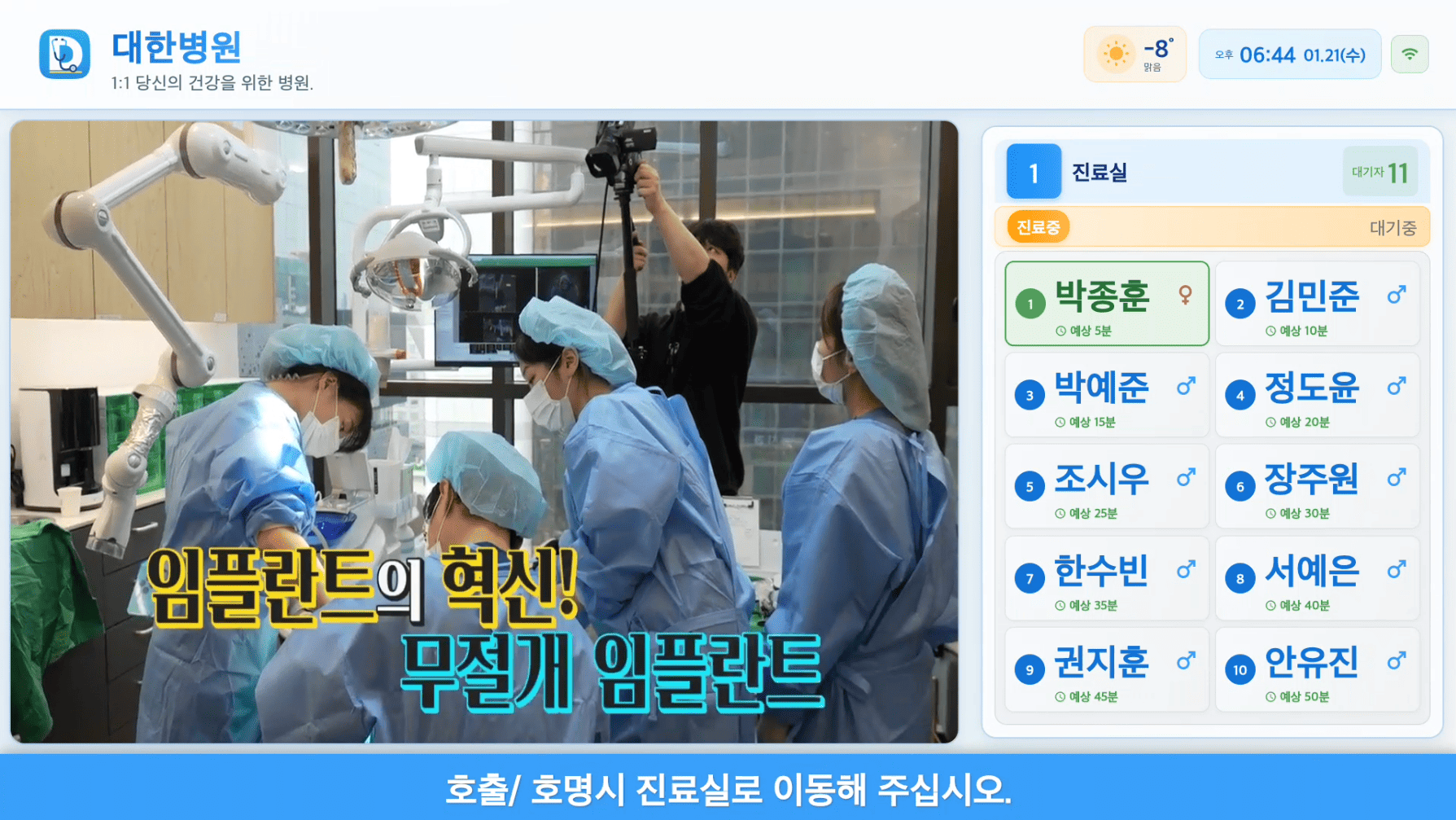 단순한 진료 대기 화면을 넘어 병원의 품격을 결정짓는 고품질의 진료 대기 화면.