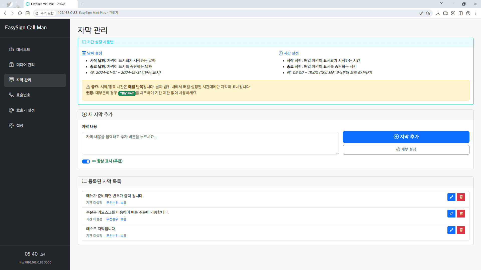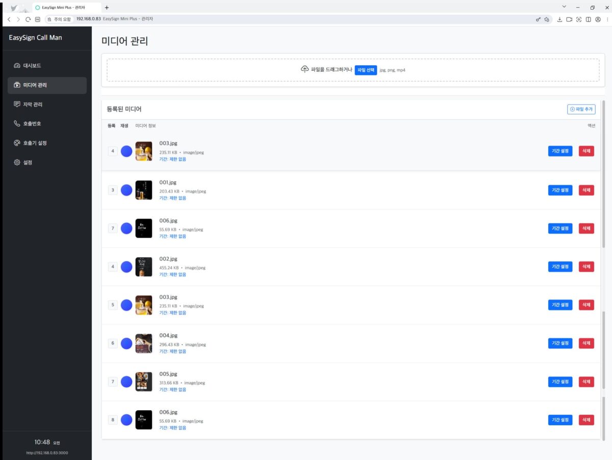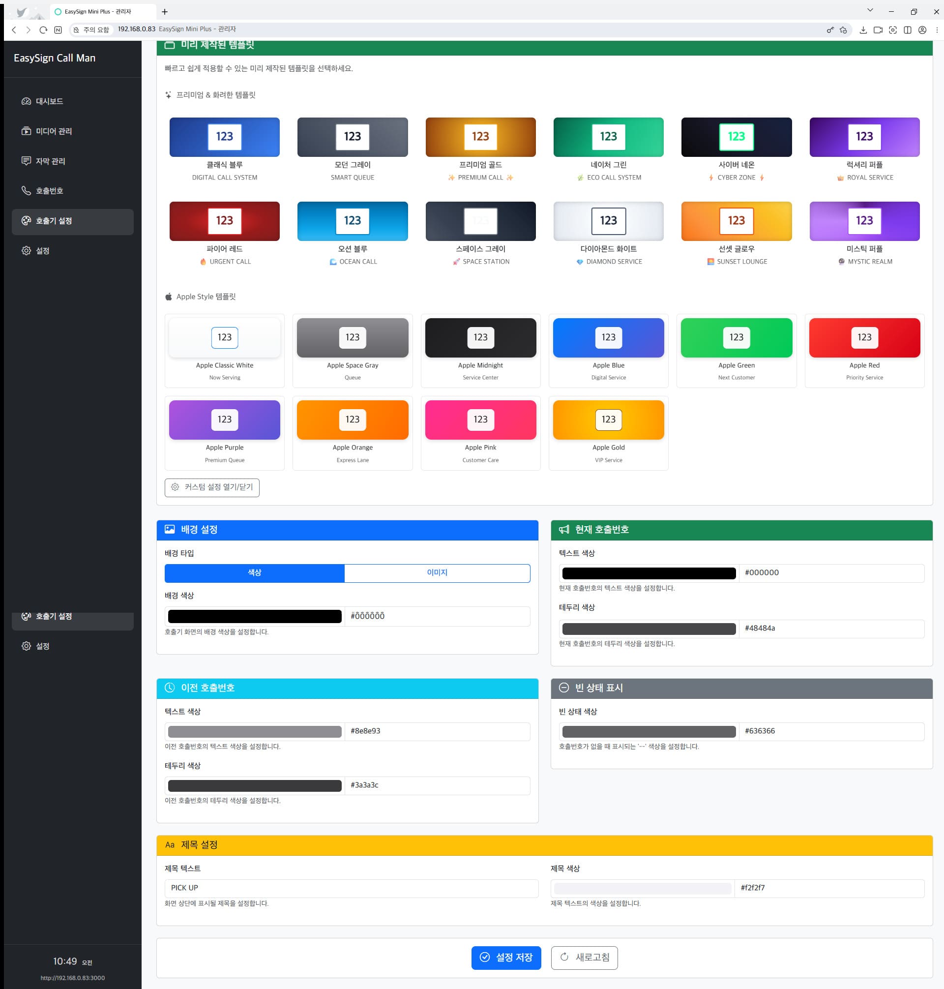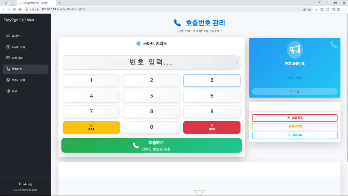 호출기 서버에 접속한 후, 웹 기반 UI를 통해 순번 설정, 호출, 화면 구성 등 다양한 기능을 간편하게 조작할 수 있습니다.