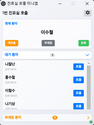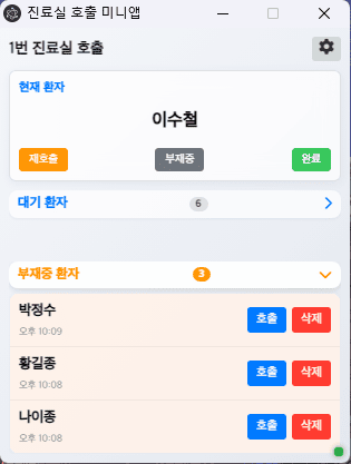 진료 호출 시스템의 미니앱 기능은 의사가 진료실에서 간편하게 환자를 호출할 수 있는 PC용 프로그램입니다. 작은 창(320x420px)으로 실행되며, 의사가 다른 작업을 하면서도 쉽게 환자 호출을 관리할 수 있습니다. 네트워크를 이용하여 실시간 연결을 통해 메인 서버와 연동되어 현재 진료중인 환자 정보와 대기 환자 목록을 실시간으로 확인할 수 있습니다.