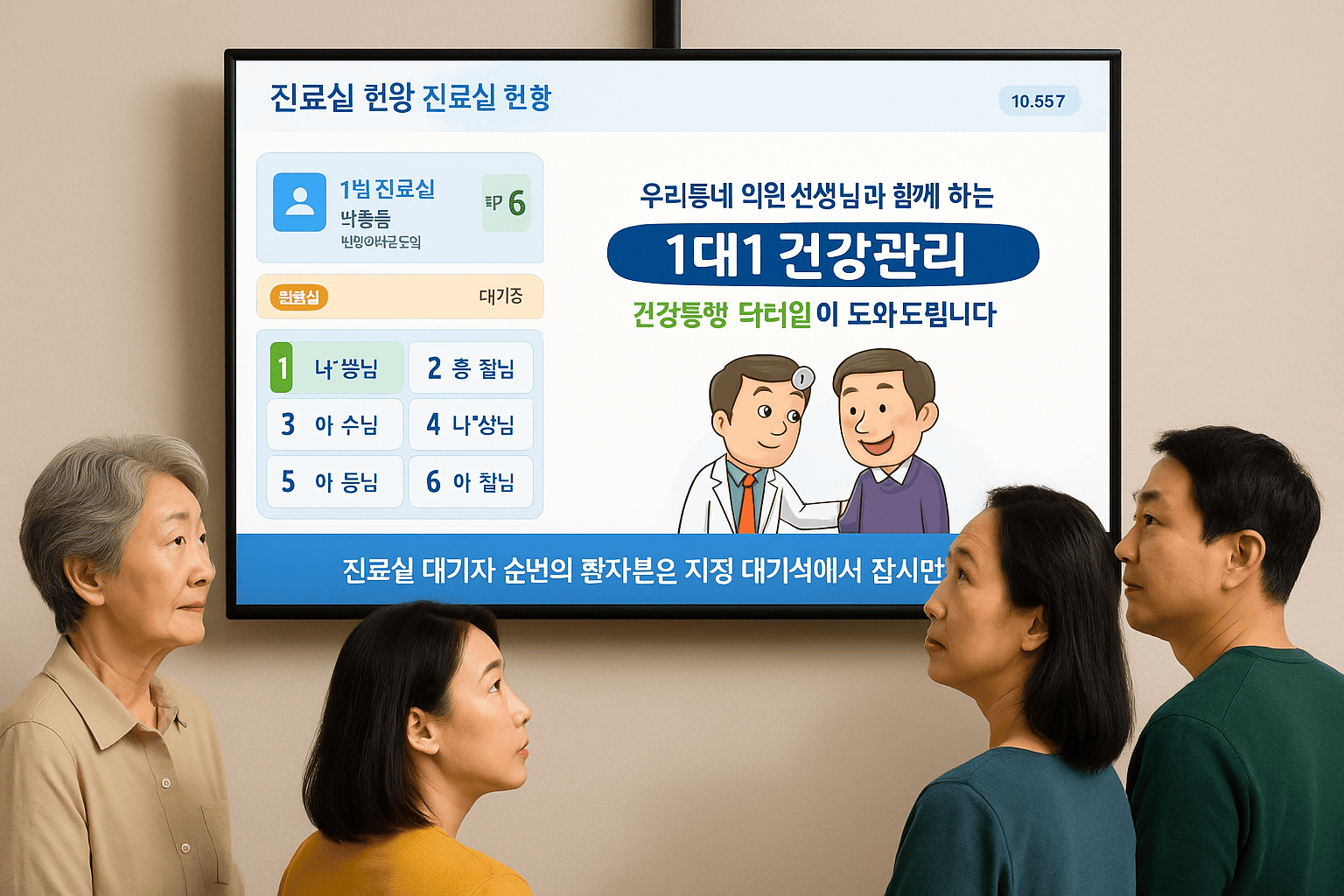 진료실 앞 TV에서 대기자 정보를 보여줍니다.