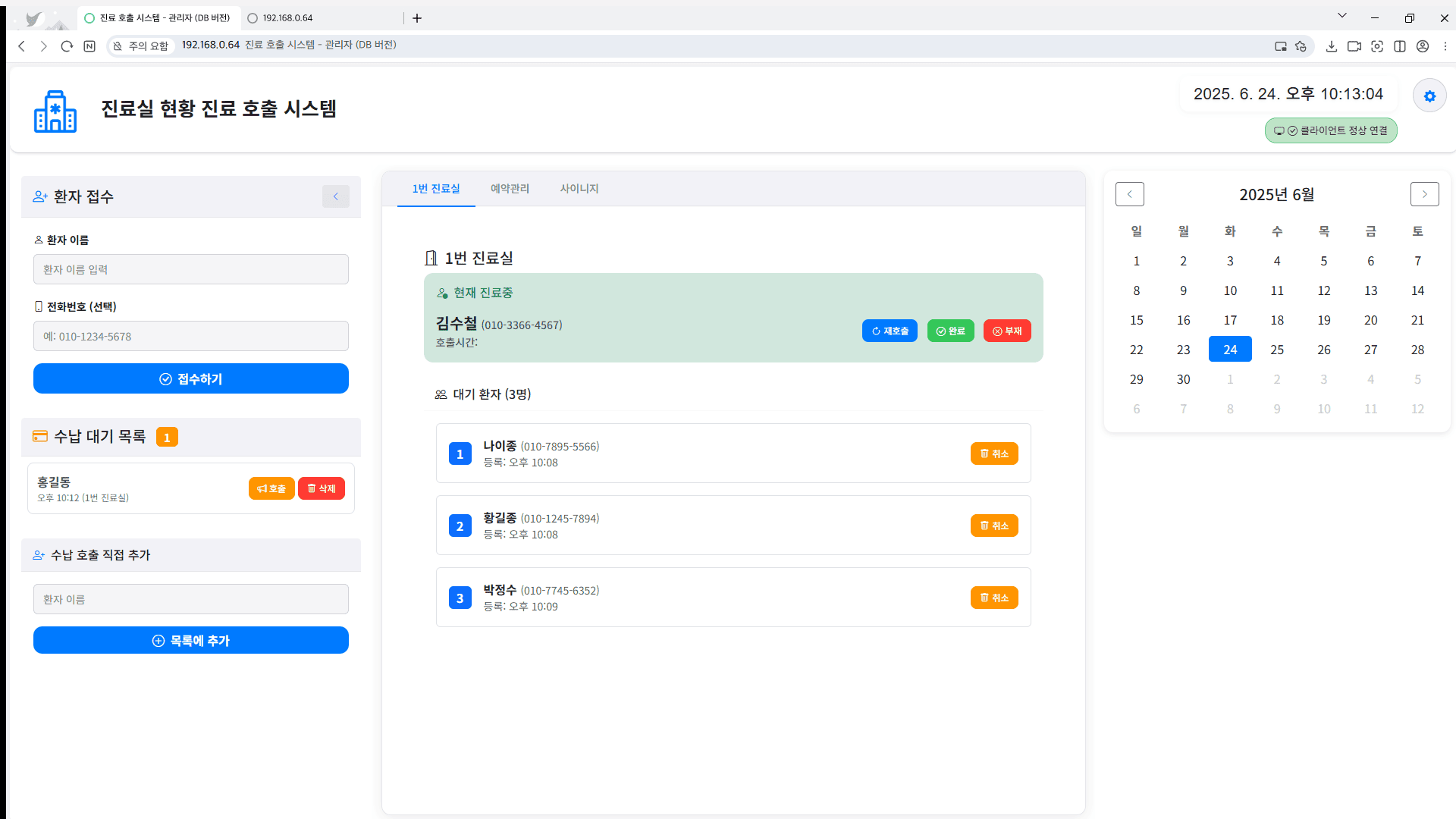 또한 각 대기 환자별로 개별 호출 버튼을 통해 즉시 환자를 호출할 수 있습니다. 현재 진료중인 환자에 대해서는 재호출과 진료 완료 기능을 작동할 수 있으며, 호출 시 벨소리와 함께 시각적 효과를 통해 호출 상태를 명확하게 알 수 있습니다.