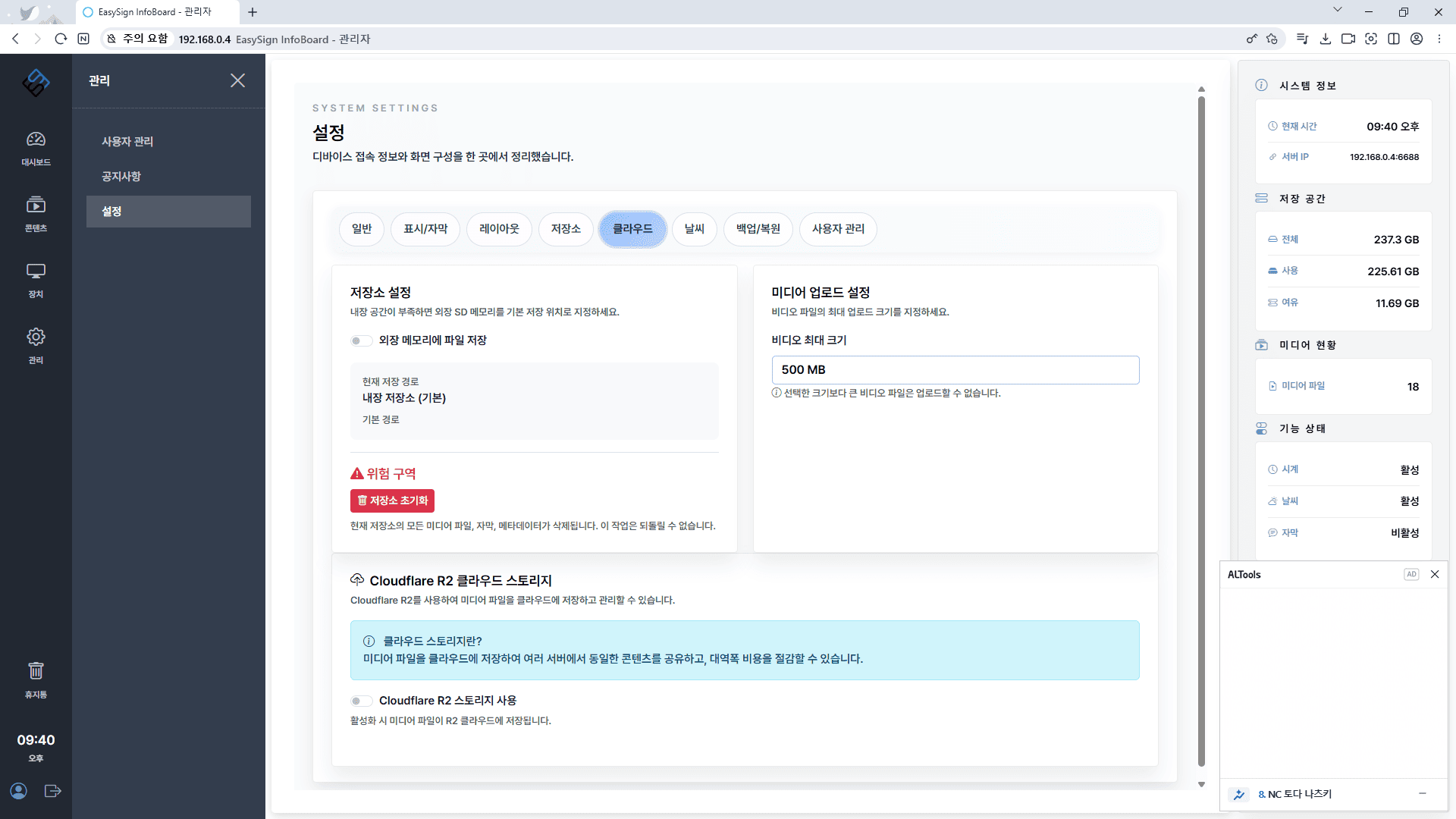 클라우드 탭에서는 Cloudflare R2(Account ID, Access Key, Bucket Name) 기반의 원격 백업 설정을 관리하고, 날씨 탭에서는 OpenWeather API 키와 도시 정보를 입력해 날씨 데이터를 표시합니다.