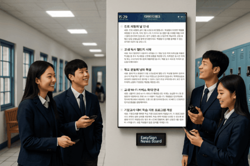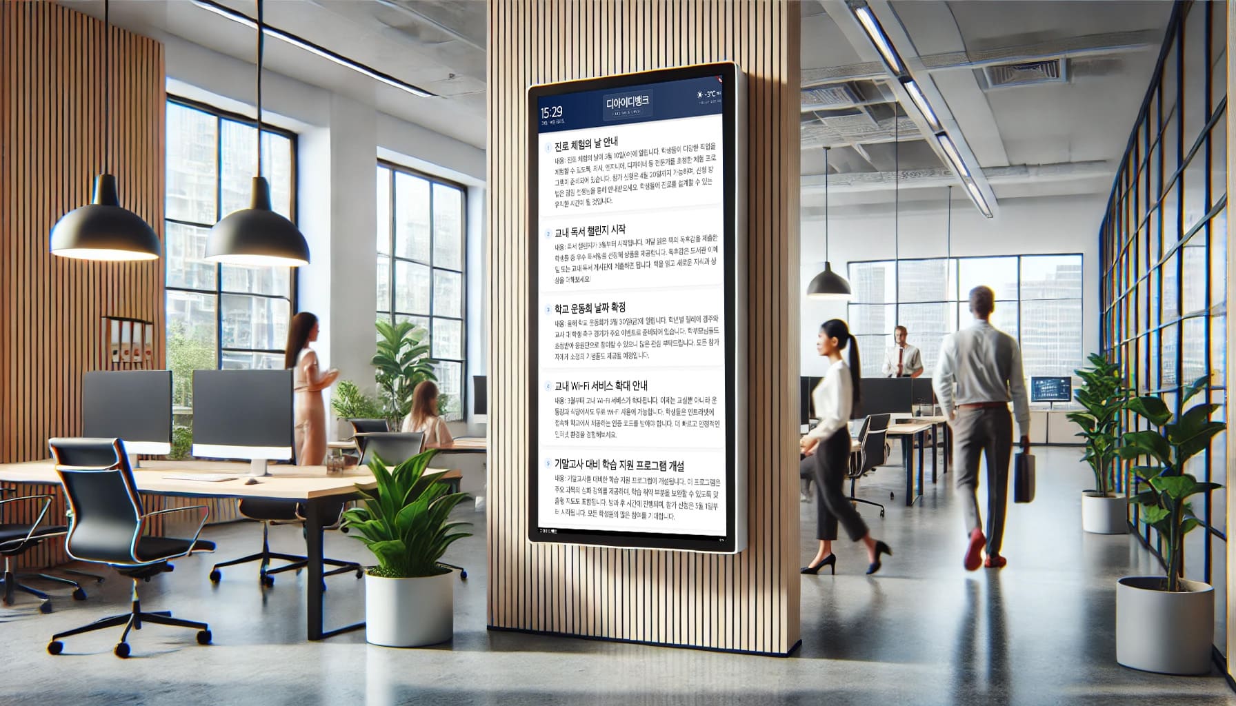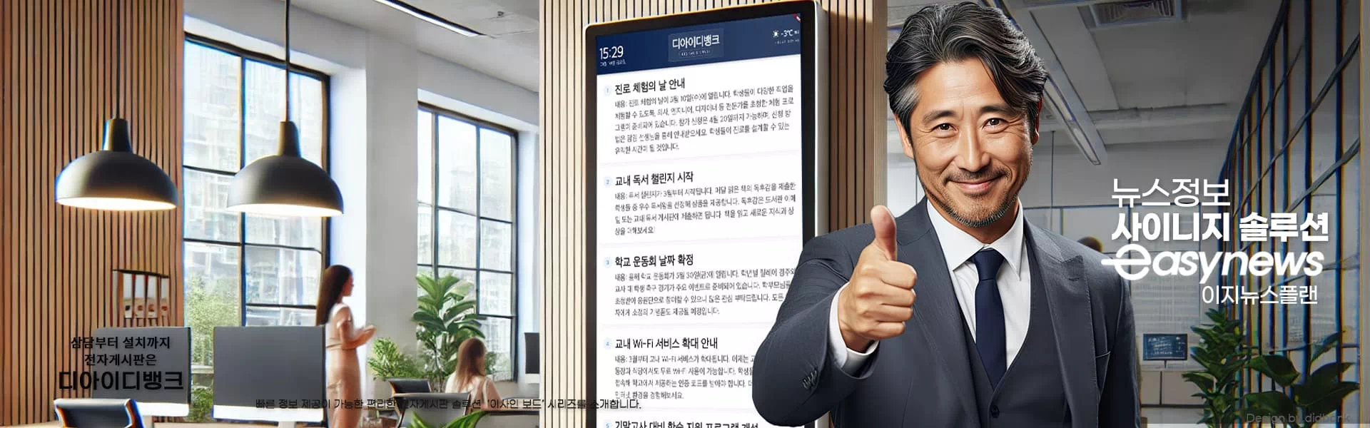 이지사인 뉴스 솔루션은 ‘문자 기반 뉴스 출력’에 최적화된 솔루션으로, 빠른 정보 전달이 가능합니다. 뉴스를 입력 즉시 화면에 반영되어 실시간 출력이 가능하며, 복잡한 편집 과정 없이도 간편하게 내용을 수정할 수 있습니다.