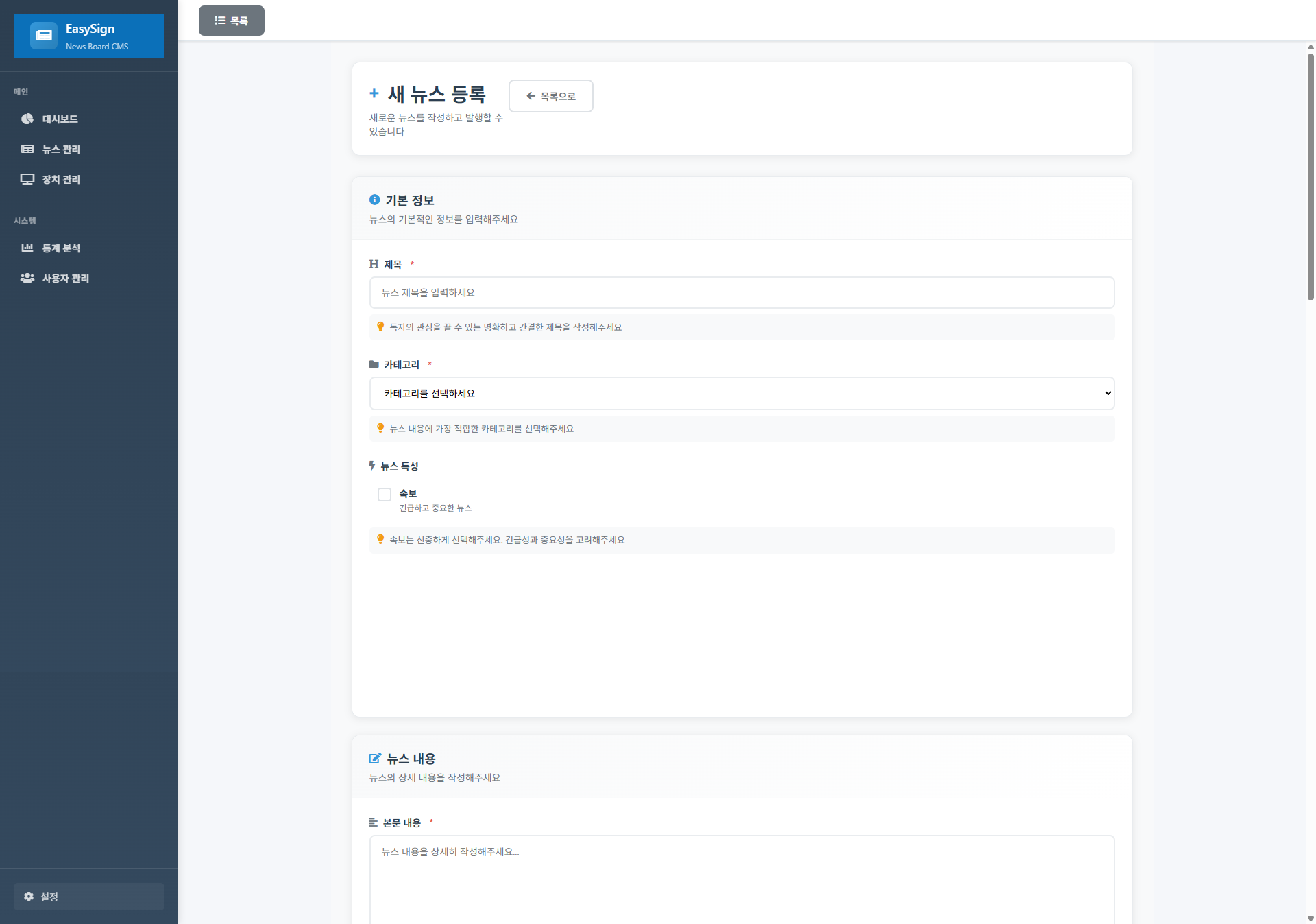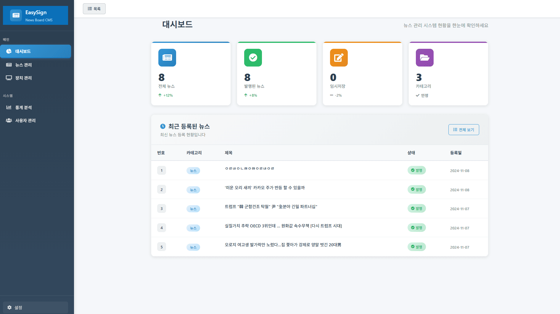 이지사인 뉴스보드 CMS의 대시보드 화면은 뉴스 콘텐츠의 전체 현황을 한눈에 파악할 수 있도록 설계되었습니다. 등록된 뉴스 수, 발행 상태, 임시 저장 여부, 카테고리 개수 등 핵심 정보를 시각적으로 제공하며, 최근 등록된 뉴스 목록도 함께 표시되어 관리 효율을 높입니다. 관리자 페이지 진입 시 가장 먼저 확인하게 되는 핵심 화면으로, 뉴스 운영 상황을 직관적으로 파악하고 빠르게 대응할 수 있도록 돕는 중심 기능입니다.