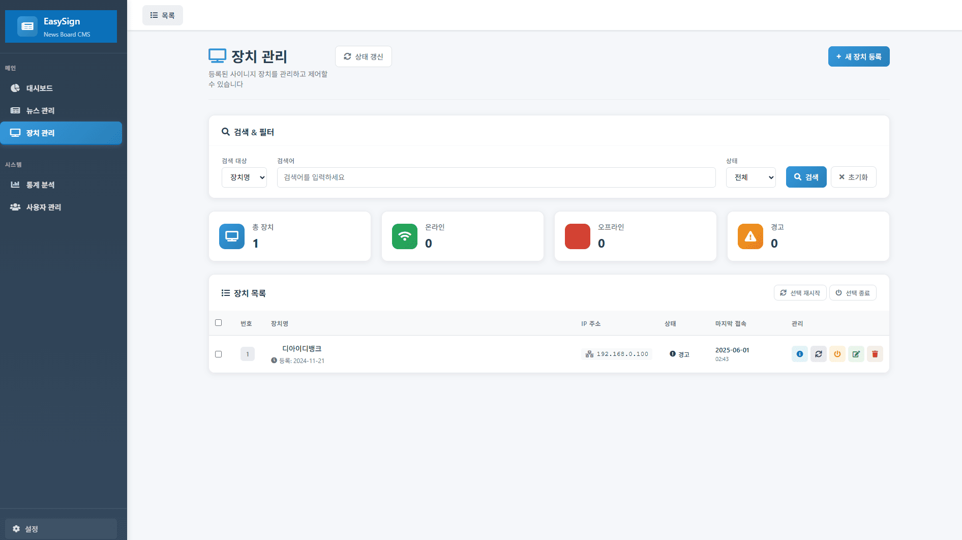 장치 관리 화면은 등록된 디지털 사이니지 장치를 통합적으로 제어하고 상태를 확인할 수 있는 기능입니다.