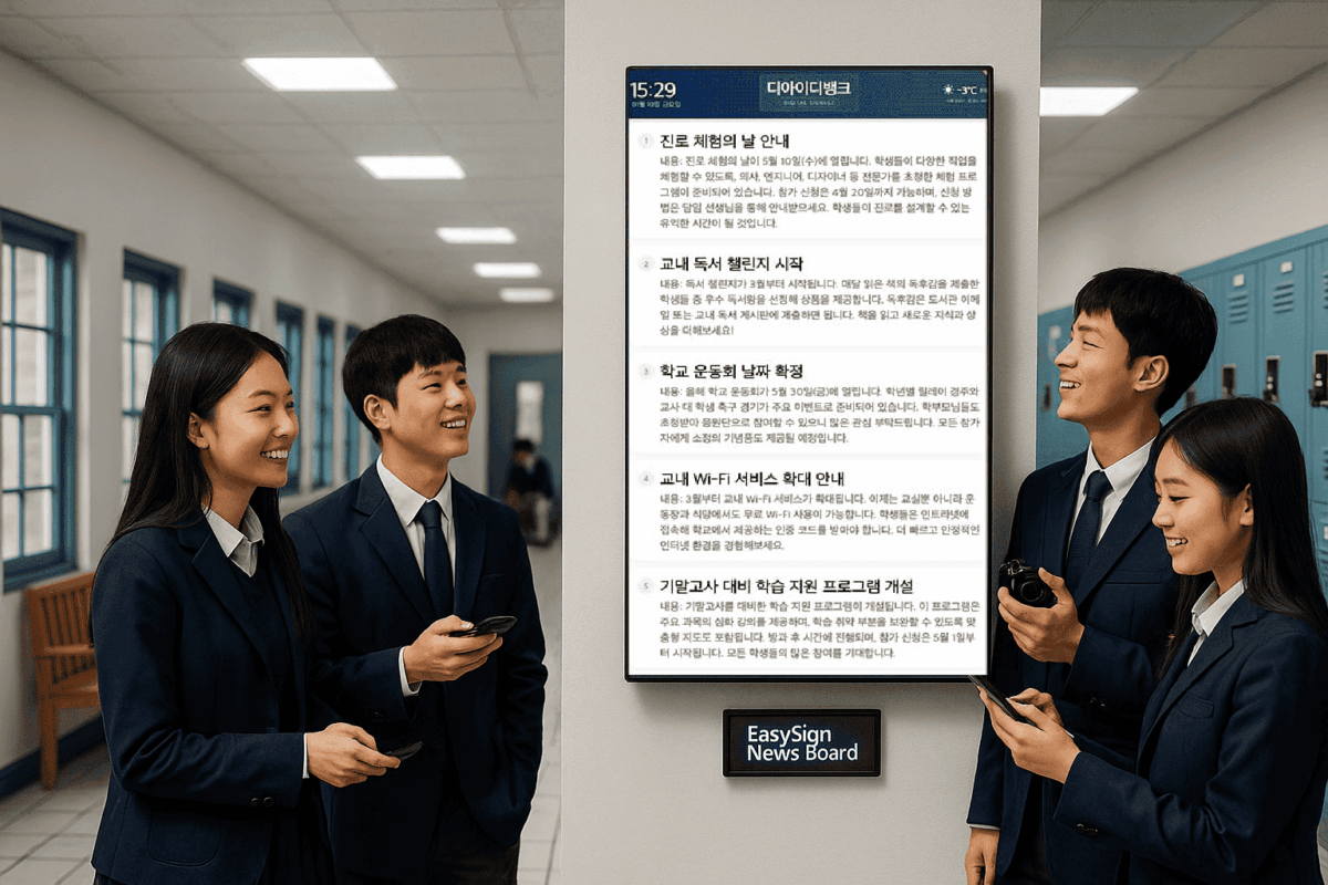 EasySign News Solution은 문자 기반 뉴스 출력이 가능한 사이니지 솔루션으로, 문자를 통한 빠른 정보 전달이 가능합니다. 뉴스 솔루션은 사용자의 문자 입력 즉시 실시간 화면에 반영되며 출력이 가능하며, 복잡한 과정 없이 간편하게 출력 문자를 수정할 수 있습니다. 또한, 일.월. 요일. 시간 별로 스케줄 설정 기능을 이용하여 효율적인 뉴스 출력이 가능한 뉴스사이니지 솔루션 입니다.EasySign News Solution은 웹 서버를 플레이어 내부에 기본 탑제하여 별도의 서버없이 독립적으로 사용이 가능하며, 웹으라우저를 이용하여 서버에 접속 바로 사용이 가능합니다. 또한 다수의 클라이언트를 시스템을 운영 관리할 수 있는 다양한 기능을 제공하는 편리한 뉴스사이니지솔루션입니다.
