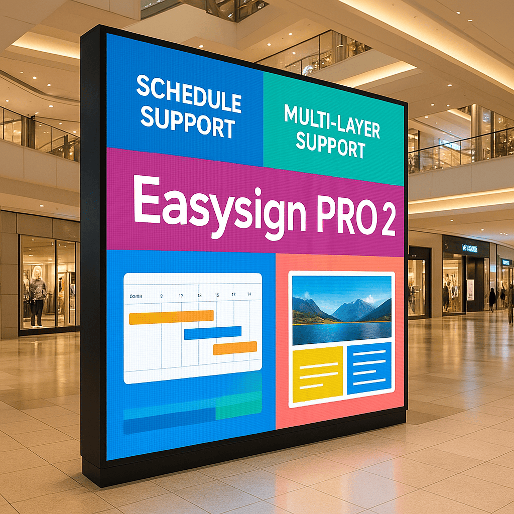 EasySign PRO 2 – 전문 디지털사이니지의 새로운 기준 EasySign PRO 2는 다양한 디지털사이니지 환경에 최적화된 최신 솔루션으로, 사용자가 직접 손쉽게 화면을 분할하고 원하는 형태의 레이아웃(멀티 레이어)을 자유롭게 구성할 수 있습니다.또한 타임셀(Time Cell) 기반의 스케줄 기능을 통해 요일별, 시간대별로 다른 콘텐츠를 자동으로 재생할 수 있어, 복잡한 운영도 손쉽게 관리할 수 있습니다. 주요 특징